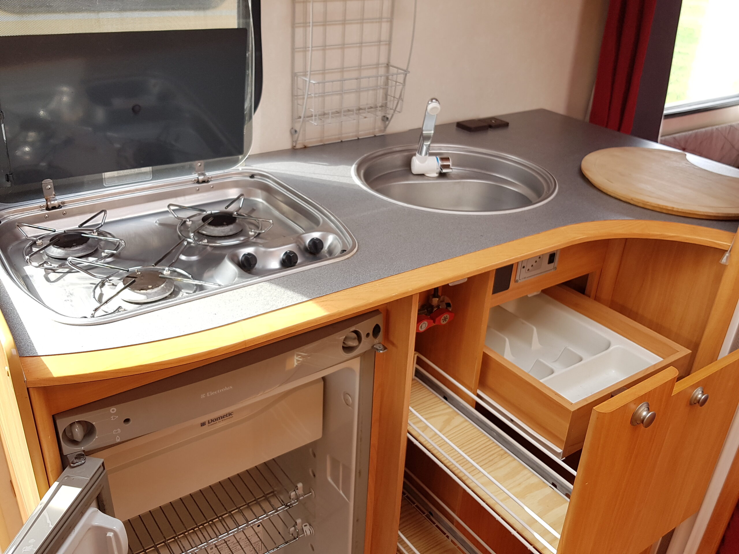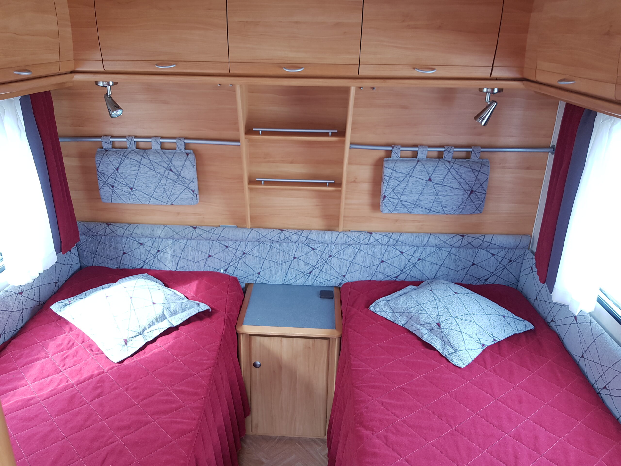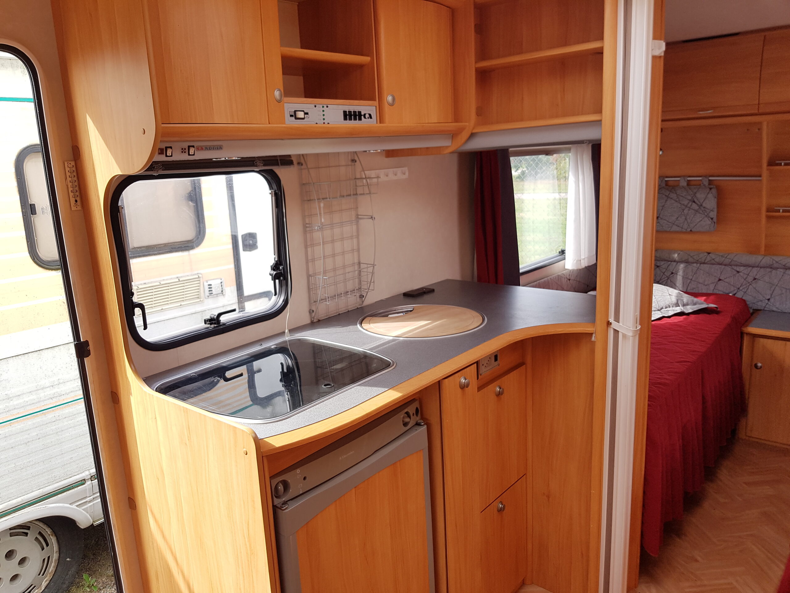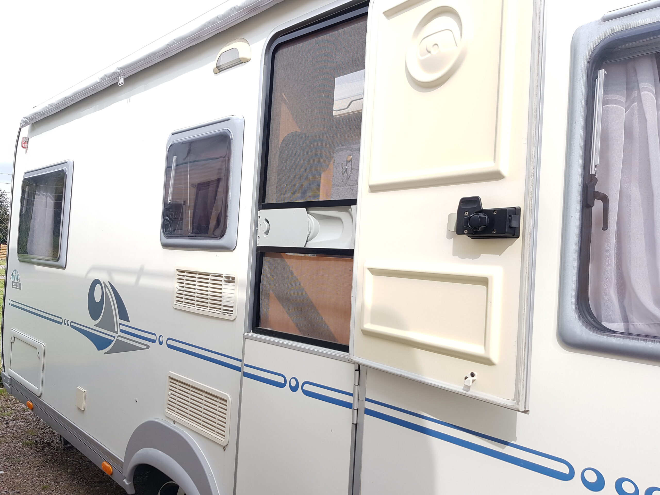 Utrustning: AL-KO drag, kök på mitten, kyl med frysfack, cykelställ, delbar dörr med halvt myggnät, markis